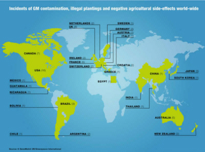 Studie 16 Greenpeace und GeneWatch UK haben ein erstes online-Register für GVO- Kontaminationen im Internet aufgeschaltet. Der weltweite Anbau von Gentech-Pflanzen auf 80 Millionen Hektaren haben zu unzähligen ungewollten Verunreinigungen von Lebensmitteln, Futtermitteln und Saatgut geführt. Über 60 Zwischenfälle sind bekannt, wo illegale Verunreinigungen stattgefunden haben. Sie betreffen alle Kontinente und insgesamt 27 Länder. ![]()